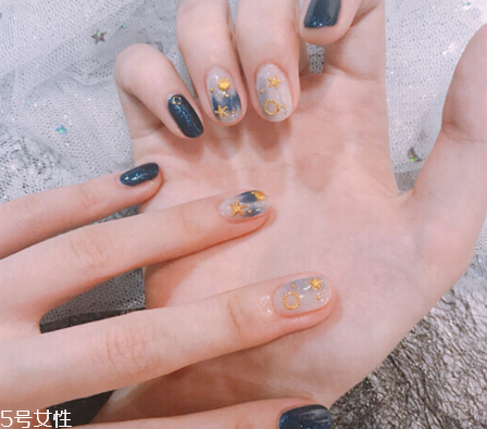 3、星月元素美甲:星月美甲這兩年可以說是比較的流行,不僅因?yàn)樗暮?jiǎn)約,而且能夠讓人覺得,看到它就像看到了滿天繁星閃爍的樣子,不僅很有氣質(zhì),而且一點(diǎn)也不覺得單調(diào),關(guān)鍵是不挑膚色好駕馭。